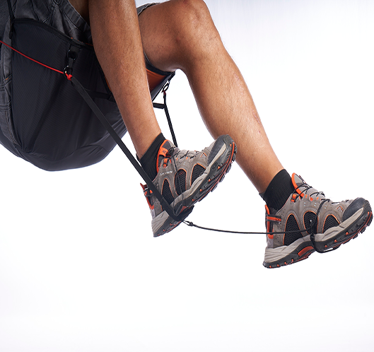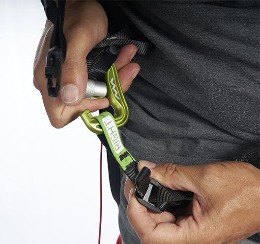 •  Keine Schnallen, die Beingurte werden in die Hauptkarabiner eingehängt